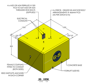 Constructed from high-strength reinforced concrete, the base delivers superior durability and long-term stability in demanding outdoor environments. Integrated fork sleeves allow for safe handling with a forklift, while cast-in lifting points ensure precise and secure crane placement.