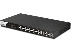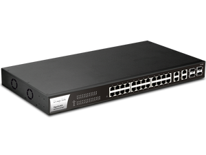 A rack-mountable, web-managed Gigabit PoE+ switch with 24 RJ‑45 PoE ports and 4 combo SFP/RJ‑45 uplinks. Ideal for SMBs with IP cameras and VoIP phones, it features powerful PoE, advanced security, VLAN types, ONVIF-friendly surveillance, and comprehensive monitoring tools.
